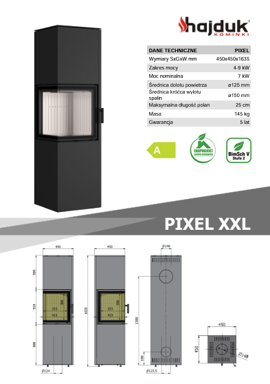 Piecyki wolnostojące Hajduk PIXEL oferowane są w trzech wysokościach. PIXEL XXL ma 163 cm wysokości. Podobnie jak niższe modele, posiada zamkniętą komorę paleniskową z wyjmowanym rusztem żeliwnym i popielnikiem. Komorę wyłożono ceramiką akumulacyjną, która posiada zdolność do magazynowania, a po wygaśnięciu ognia w piecu – stopniowego oddawania ciepła. W ten sposób koza zapewnia długotrwałe ogrzewanie nawet po zakończeniu palenia.