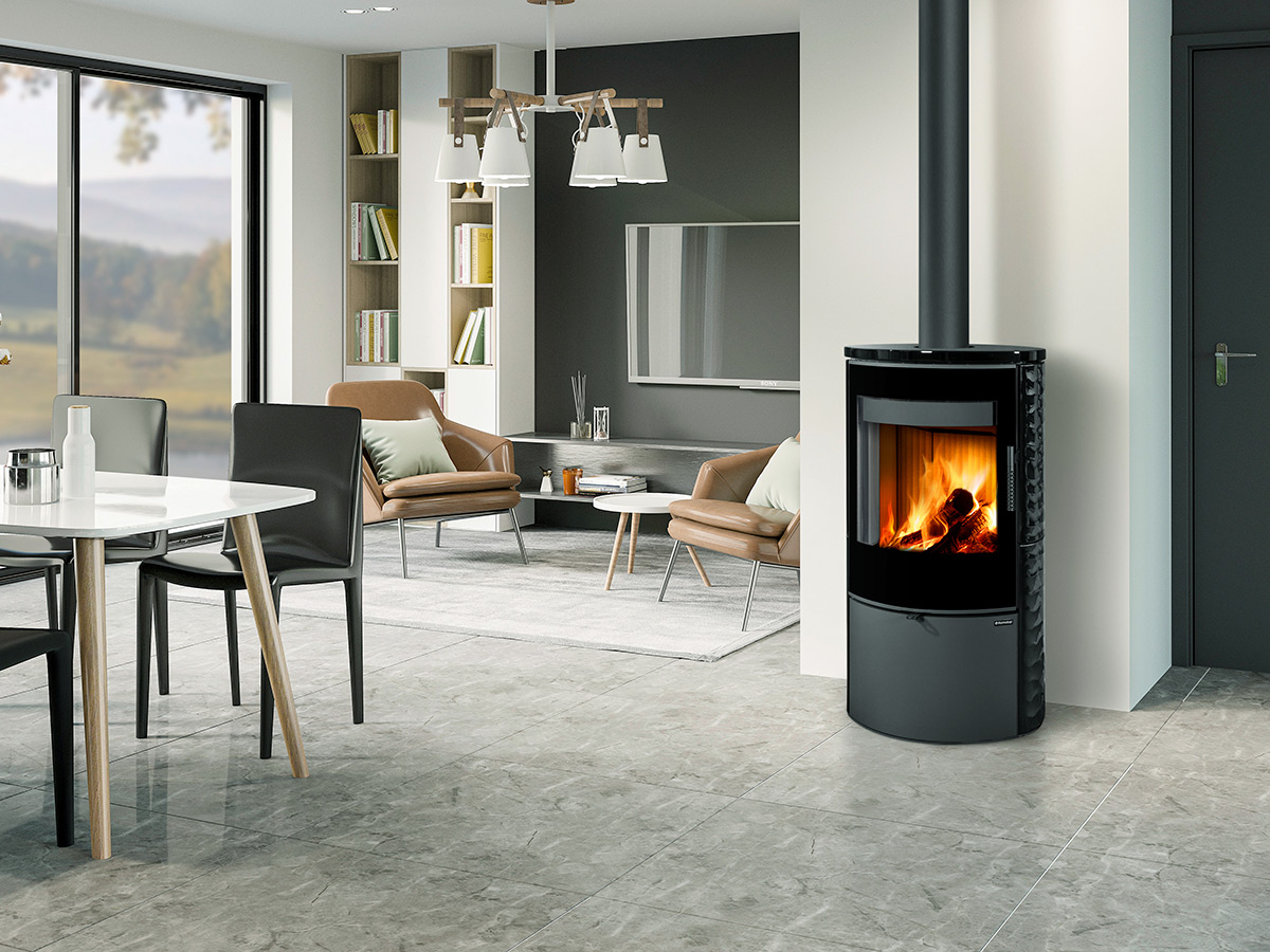 Owalny kształt pieca kominkowego SONE G wraz z designerską szybą zapewnia piękny widok ognia, który
