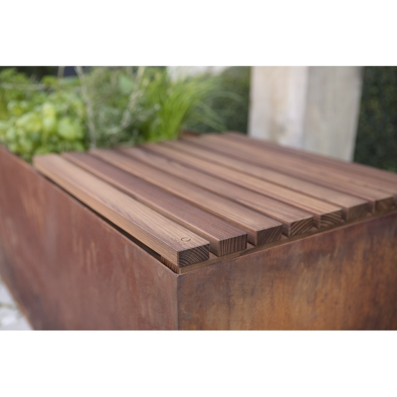 Przybliż ogród do miejsca, w którym gotujesz dzięki dwufunkcyjnej donicy i ławce. Blat z drewna tekowego tworzy wygodne siedzenie, które można przesuwać w obie strony. Idealna do siedzenia i obserwowania rosnących kwiatów. Dostępna w dwóch różnych materiałach: stali Corten lub czarnej powlekanej stali.