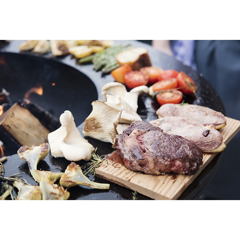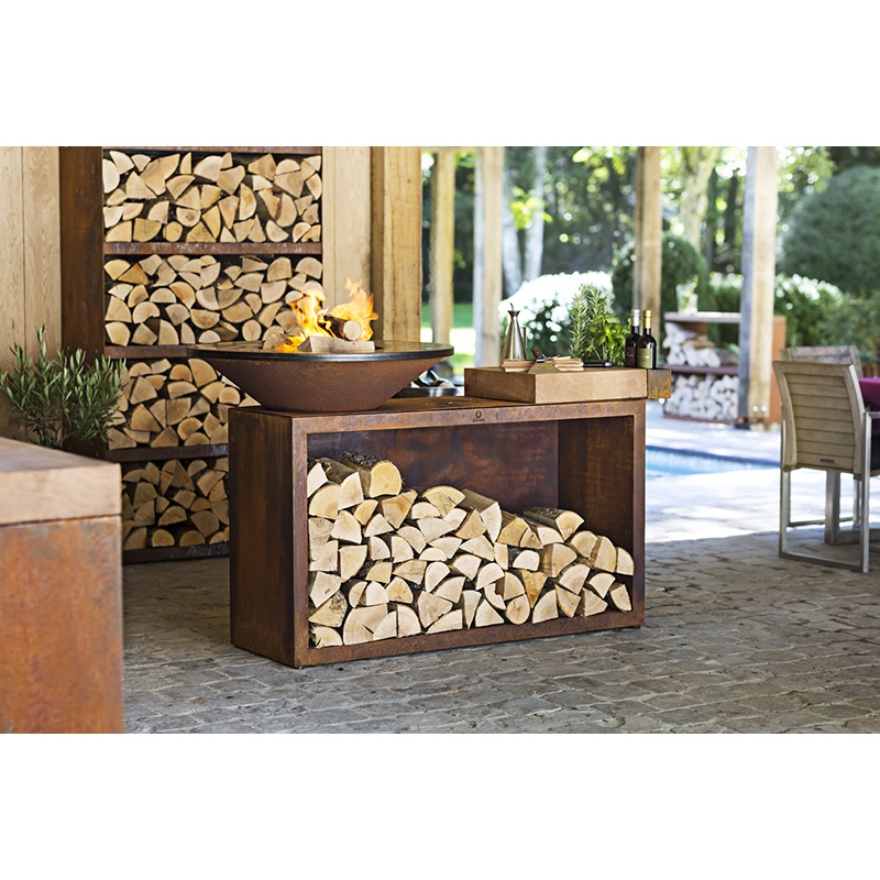 Ten model typu “wszystko w jednym” łączy w sobie niezrównany styl i funkcjonalność w kompaktowej obudowie. Wykonany jest z trwałej stali Corten o średnicy 100 cm ze schowkiem na drewno, ceramiczną deską do krojenia i poręczną tacą na przybory i przyprawy.