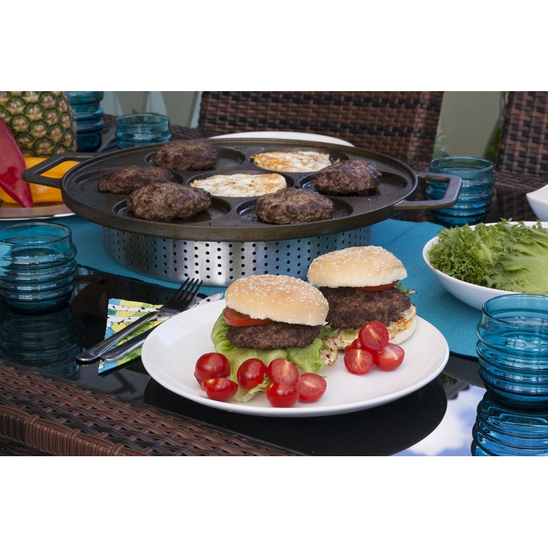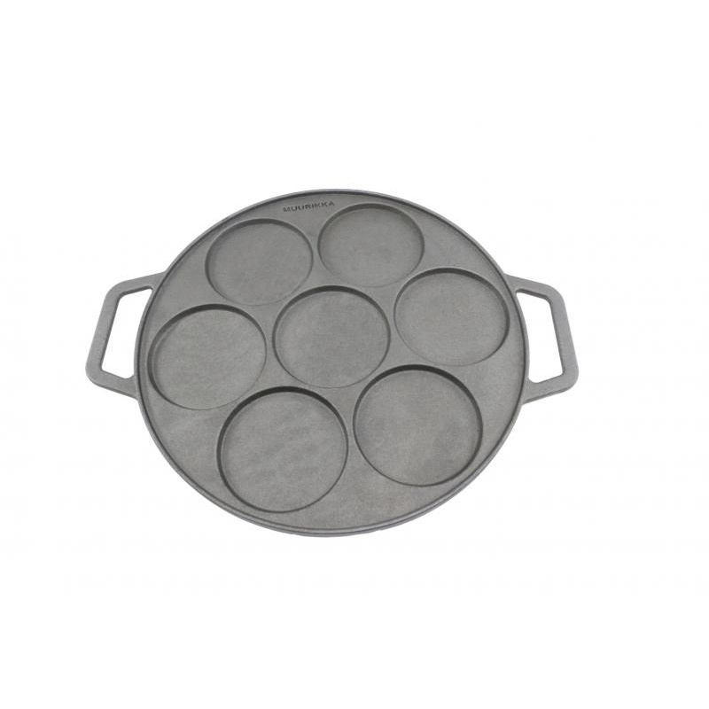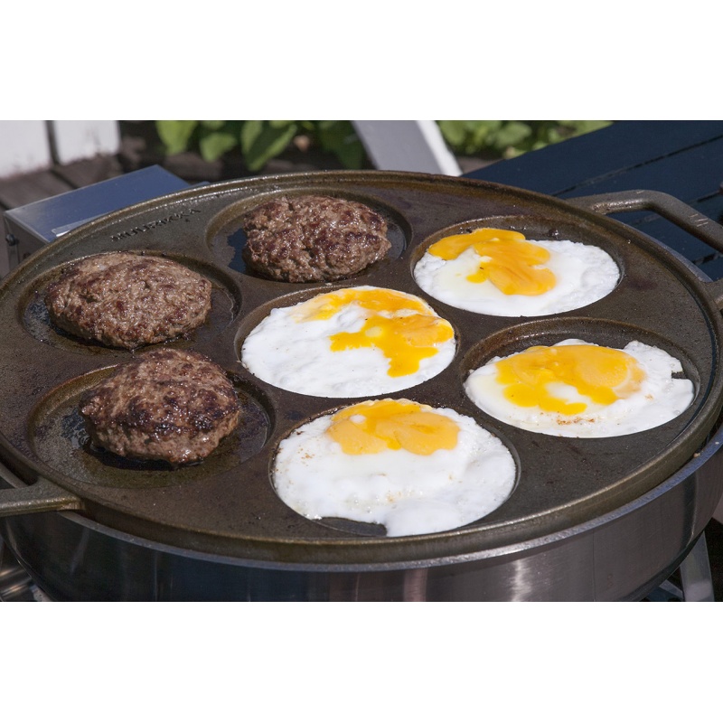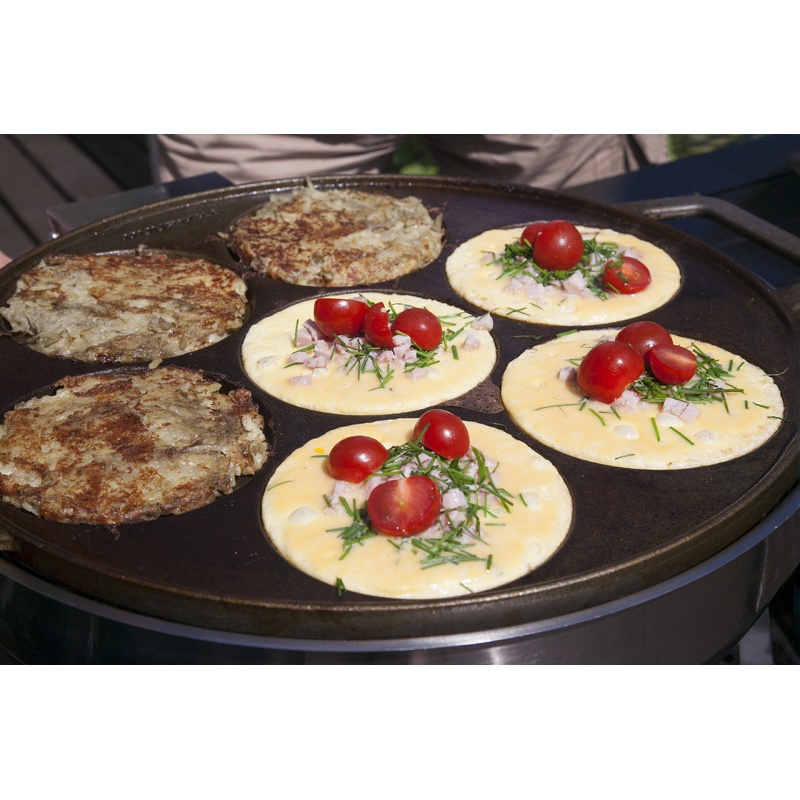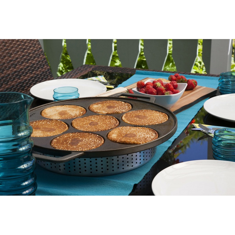 Patelnia żeliwna multifunkcyjna o szer. 41,5 cm została stworzona z myślą o smażeniu potraw o płynnej konsystencji. Z łatwością można przyrządzić na niej placki, naleśniki, racuchy czy jajka sadzone dzięki 7 wgłębieniom o średnicy 12,7 cm.