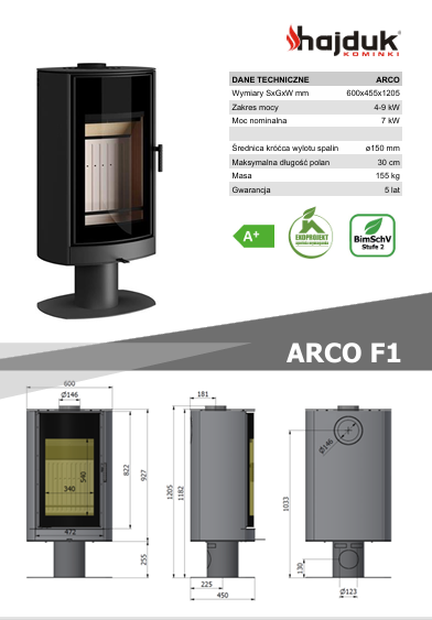Piec Hajduk ARCO F1 to świetna alternatywa dla tradycyjnego kominka. Nowoczesne kozy zajmują znacznie mniej miejsca, są łatwe w montażu i dostępne w atrakcyjnych cenach. Opalany drewnem ARCO F1 posiada przy tym wiele różnych funkcji. Piecyk wyposażono w system czysta szyba „Clear View”, a także system wielokierunkowego napowietrzania komory spalania. Nowoczesne piece typu koza zostały wykonane w taki sposób, by jak najdłużej utrzymywać ciepło. Komora spalania piecyka ARCO 1 została wyłożona płytami ceramicznymi, które akumulują ciepło, a po wygaśnięciu ognia stopniowo uwalniają je do pomieszczenia.
