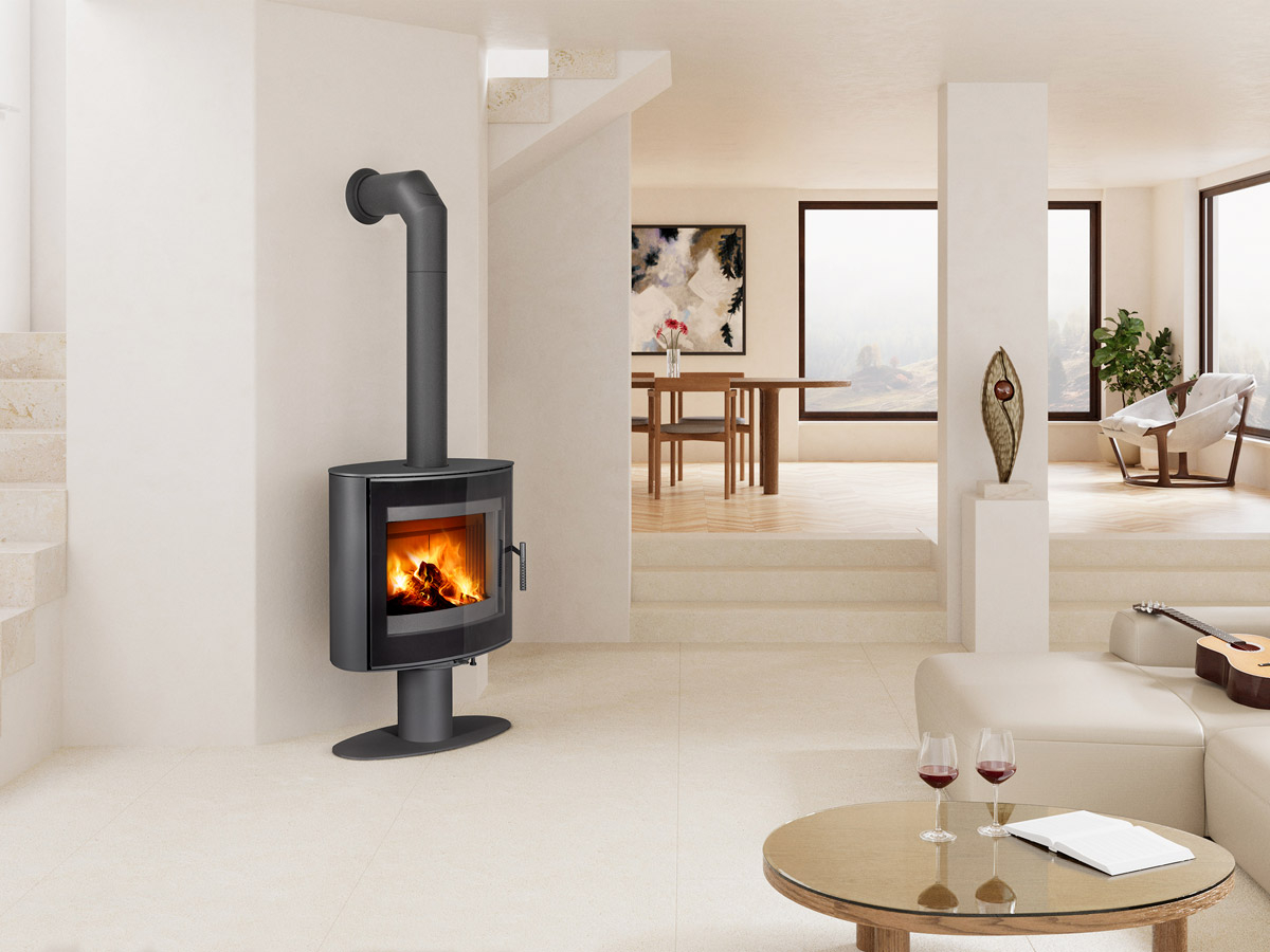 stopa umożliwia wygodny obrót pieca, co gwarantuje idealny widok ognia zarówno z obszaru wypoczynkowego, jak i jadalni.