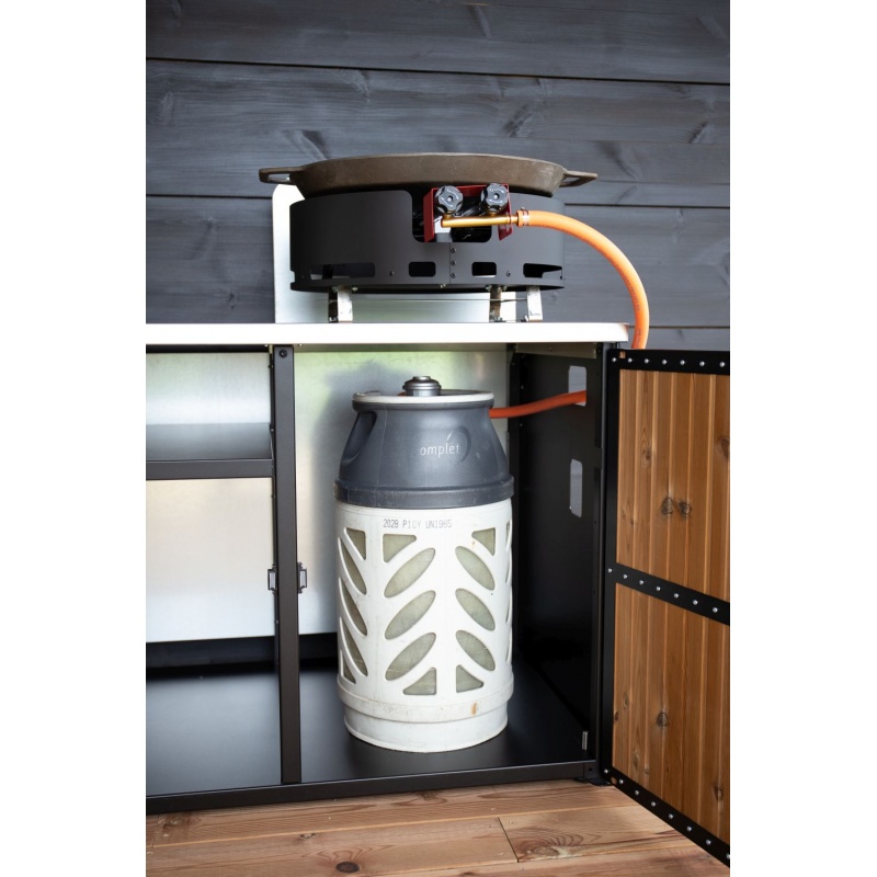 Uwaga! Jeśli instalujesz stół lub szafkę przy łatwopalnej ścianie, podczas korzystania z palnika gazowego będziesz potrzebować oddzielnej płyty chroniącej przed wysoką temperaturą. Podczas korzystania z palnika gazowego nie należy dostawiać stołu kuchennego ani szafki do ściany. Zamiast tego pozostaw 10-centymetrową przestrzeń między ścianą a stołem i szafką. Summer Kitchen Table and Cabinet są przystosowane do przechowywania butli gazowej. Podczas korzystania z palnika gazowego wyjmij butlę gazową ze względów bezpieczeństwa. Przed ponownym schowaniem butli upewnij się, że zawór jest zamknięty.