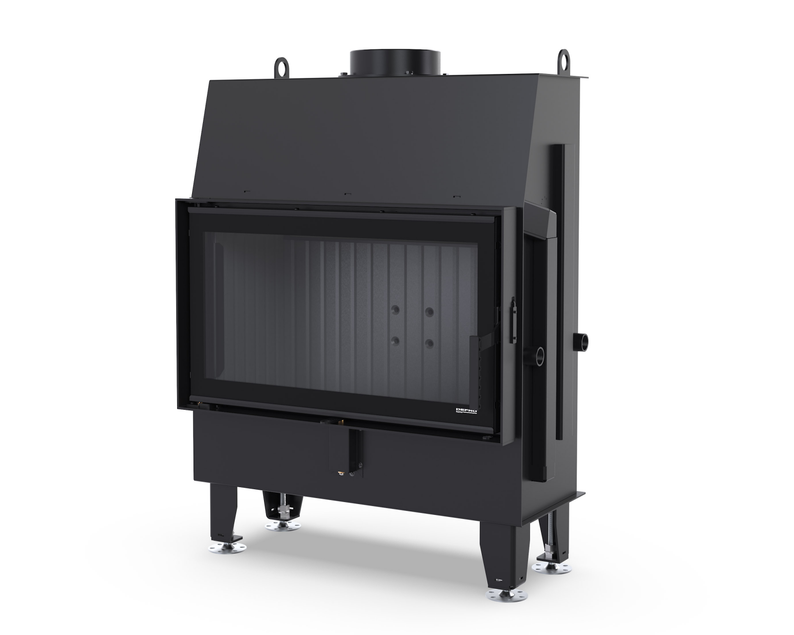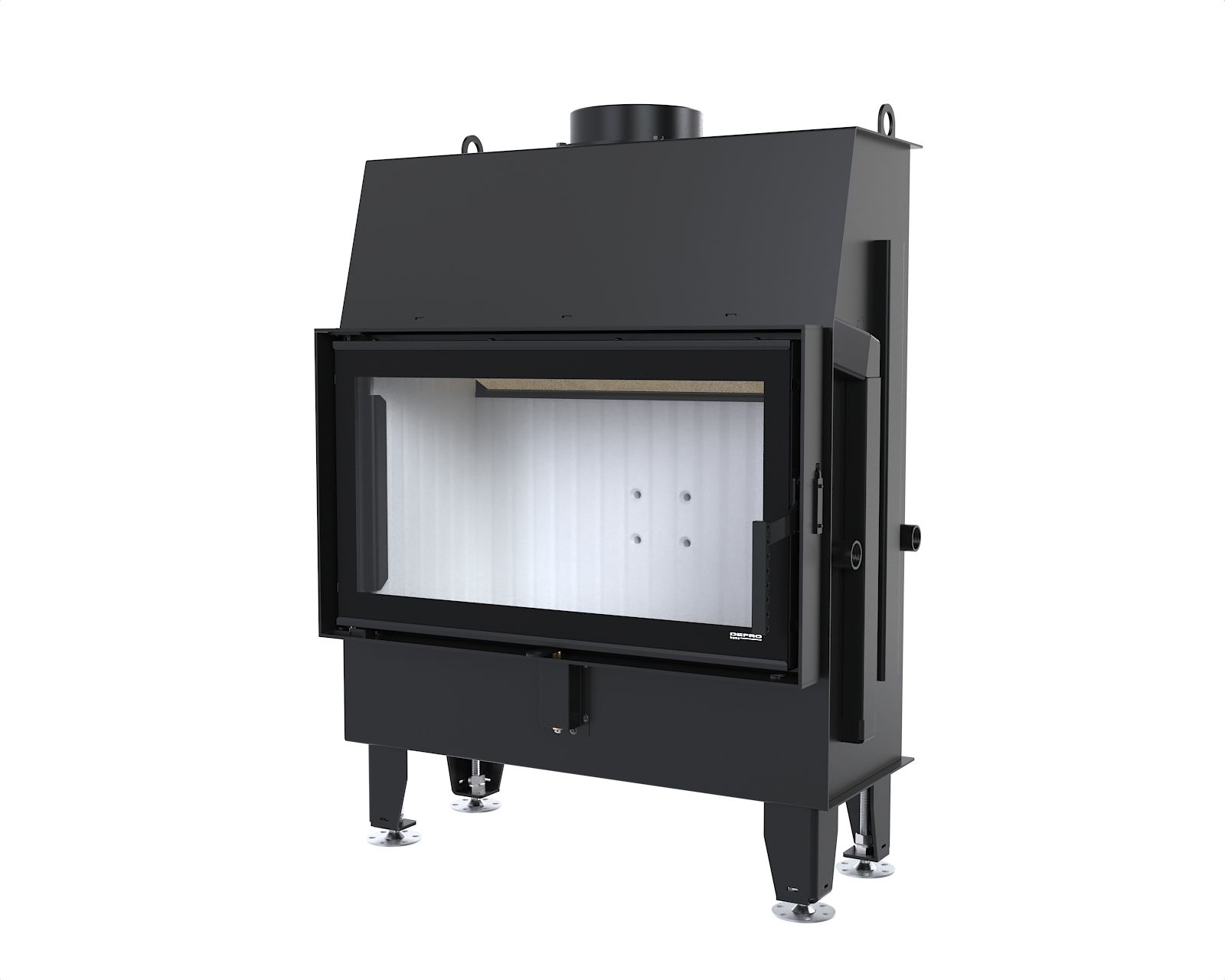 Konstrukcję wzmacniają gęsto rozmieszczone radiatory na ścianach zewnętrznych urządzenia, co przyspiesza wymianę cieplną i podnosi sprawność grzewczą. Wysoki czopuch Ø150 mm stabilizuje ciąg w kominie, a system DGP rozprowadza gorącego powietrza kratkami do łączonych pomieszczeń.